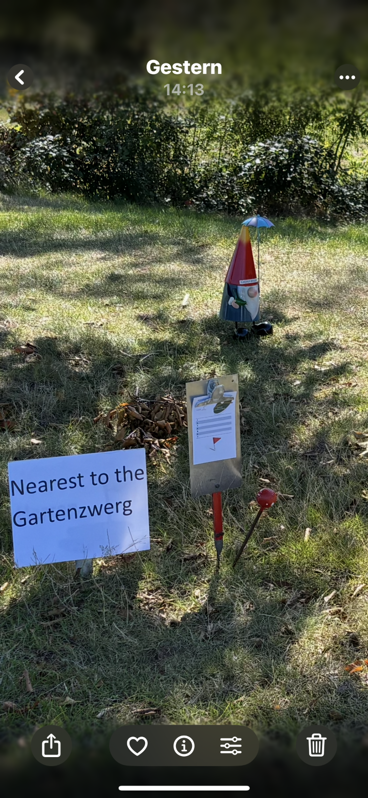 Von nassen Bedingungen konnte keine Rede sein. Davon waren wir weit entfernt. Temperaturen nahe 30 Grad. Nur der nasse Bruder (in Gestalt eines Gartenzwergs) an der 5 hatte ein dauerhaft schattiges Plätzchen erwischt und wartete gespannt darauf, wer ihm nach dem Abschlag am nächsten kommen würde (Bild 1). Bei der Siegerehrung hatte der Sieger sich allerdings schon aus dem Staub gemacht, was den Gartenzwerg etwas traurig machte. Ansonsten konnte man allerdings von einem rundum gelungenen Golfevent der nassen Brüder sprechen. An der 9 erfreuten Nicole, Rachelle und Patricia mit Grillwürstchen (von der Metzgerei Arneth) die einzelnen Flights . Natürlich gab´s auch Kaffee und Kuchen und die ein oder andere Spielgruppe bevorzugte Schorle. Vielen Dank. (Bild 2)